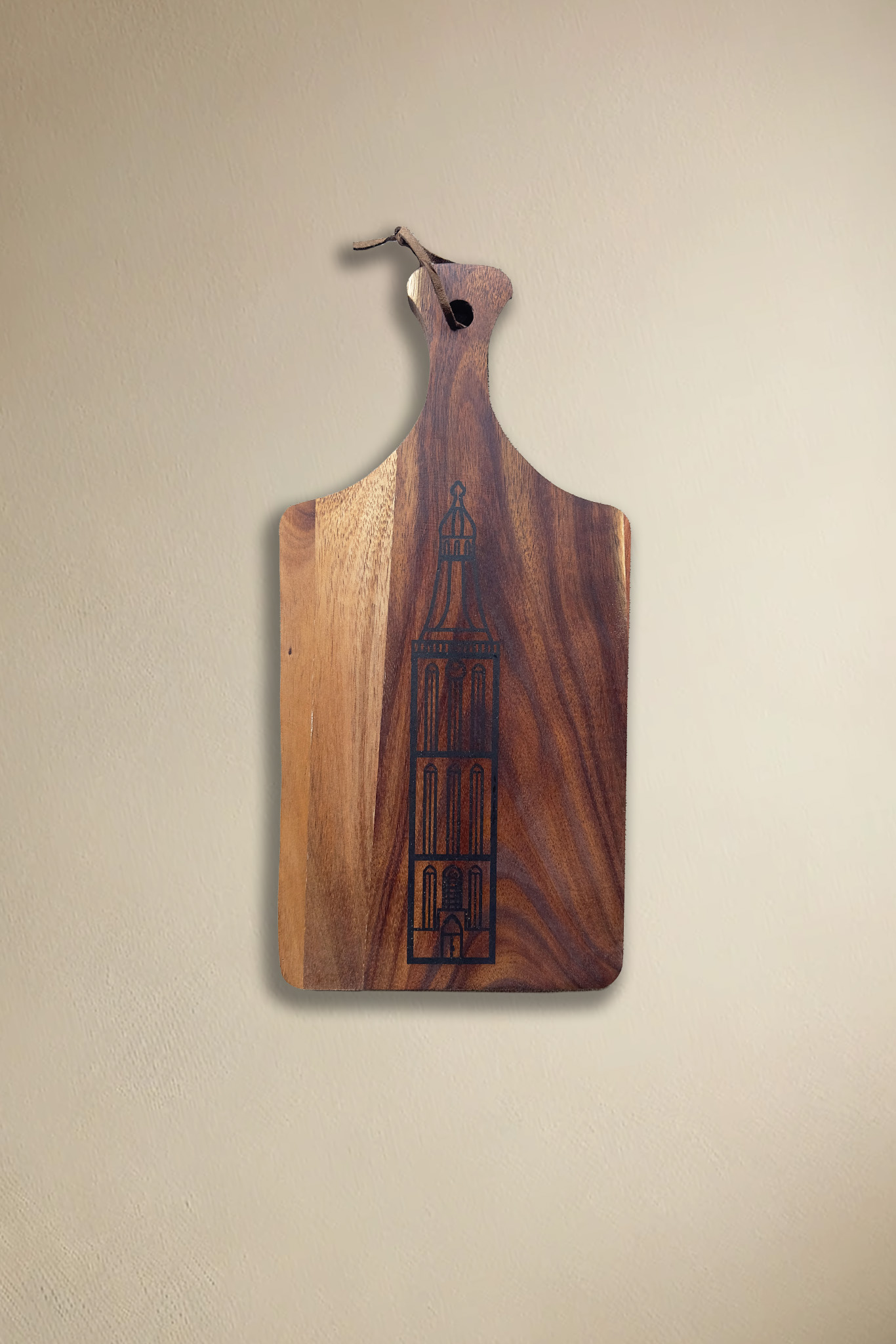 Met een royale afmeting van 37×18 cm en een stevige dikte van 1,5 cm biedt de Borrelplank Stadstoren Hasselt voldoende ruimte voor heerlijke hapjes, kazen, charcuterie, broodsoorten of tapas. Het gebruik van acaciahout zorgt voor een warme uitstraling en een levendige houtnerf, waardoor elke plank uniek is. Niet alleen de gravure maar ook de natuurlijke tekening van het hout maakt dit product tot een decoratieve blikvanger op tafel. De stadstoren is met precisie ingekerfd, zodat de karakteristieke vormen van De Oude Stadstoren helder zichtbaar blijven zonder aan elegantie te verliezen.